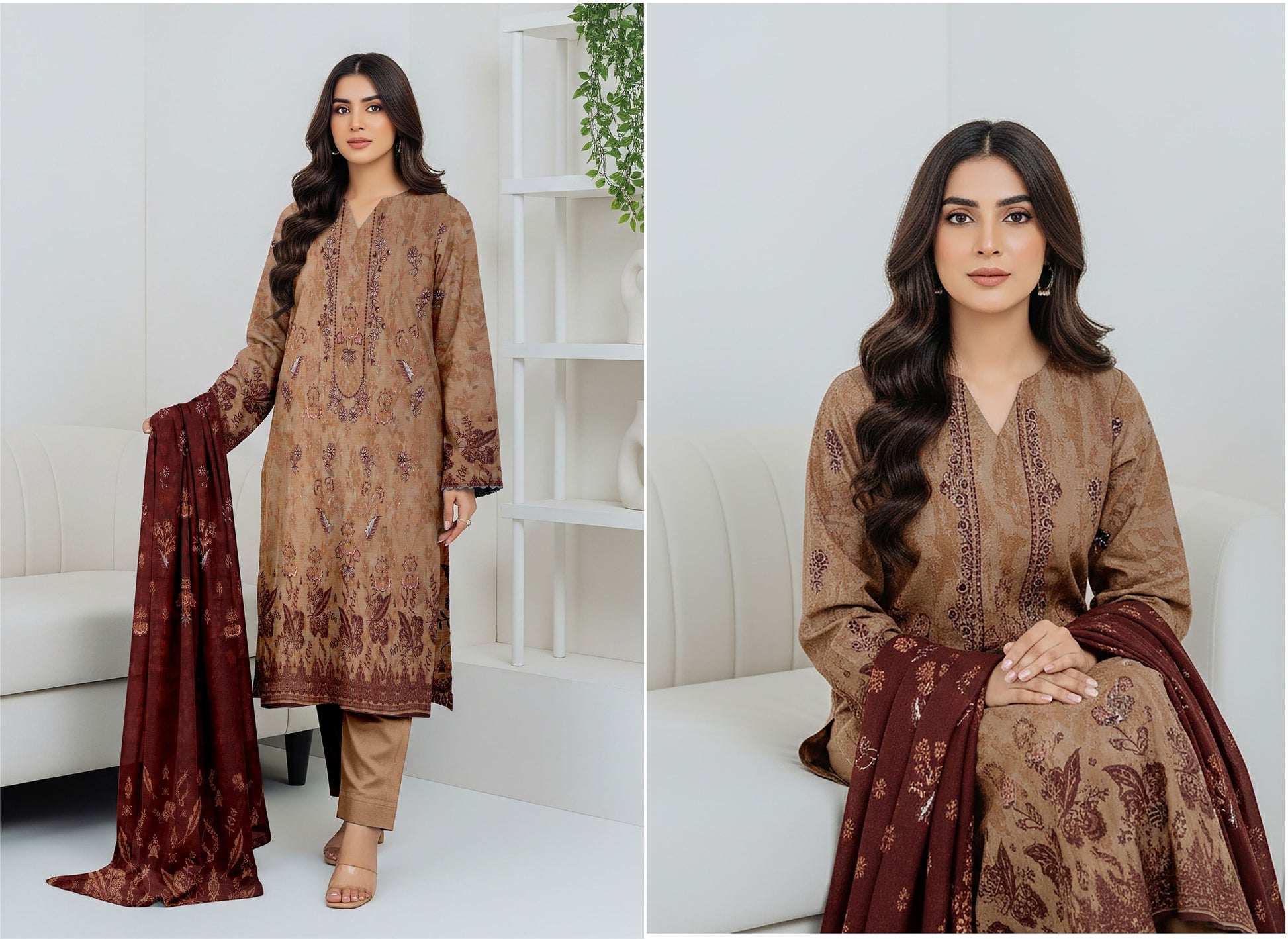 Featuring a Digital Print Premium Shirt with Heavy Embroidery Front, enhanced with a Double Head Embroidered Slub Voil Dupatta, combining traditional craftsmanship with contemporary digital prints.